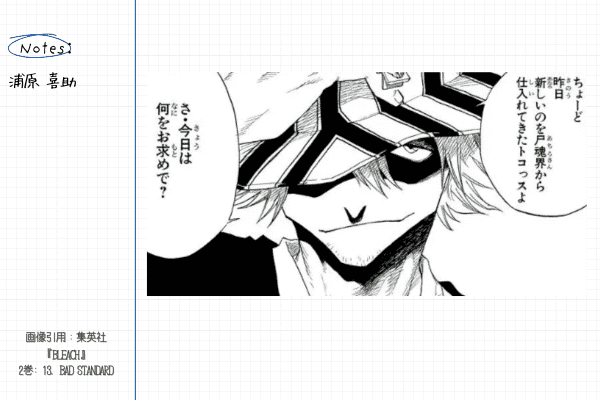 ひょうひょうとしたマイペースな態度と軽い口調が特徴的で、尸魂界(ソウル・ソサエティ)の便利アイテムなどを横流ししています。