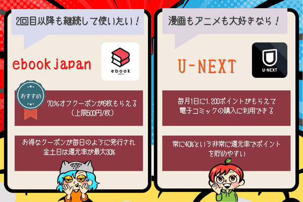 • ebookjapan:試し読みが充実しており、セールや割引クーポンの対象になることも多い。