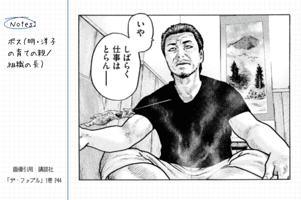 ファブルの所属する暗殺組織の長であり、明と洋子を幼い頃から育ててきた人物。
