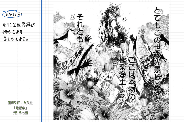 『地獄楽』は、ジャンプ+作品の中でも特にダークで大人向けの作風が特徴で、グロテスクな描写や宗教観・生死観を含んだ世界設定が話題となりました。
