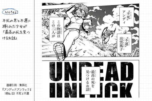 『アンデッドアンラック』は、「不死」と「不運」という一風変わった能力を持つ二人の出会いから始まるバトル漫画です。