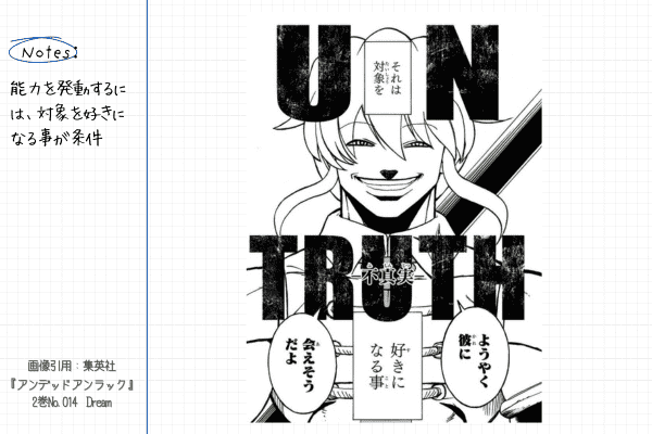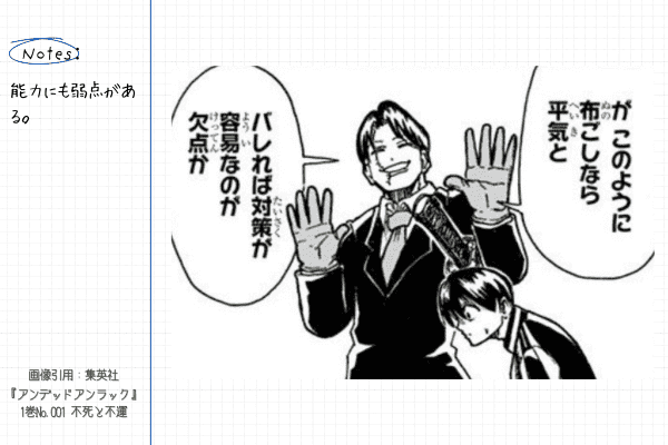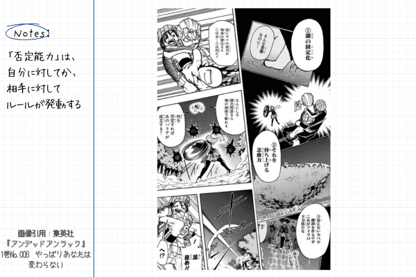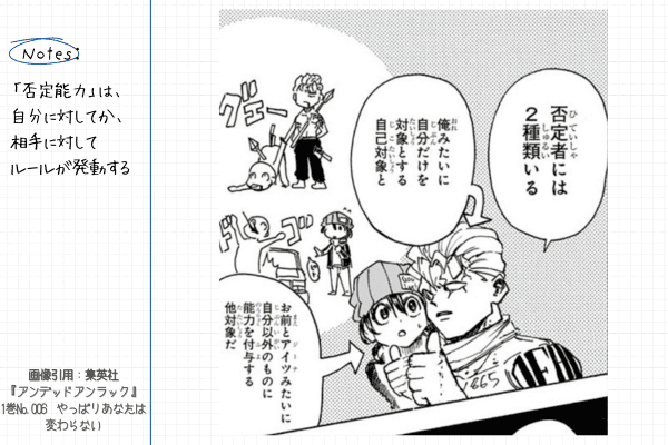 本作では「アンデッド」や「アンラック」など、普通のバトル漫画とは異なる能力が登場し、さらに「否定能力」という概念のルールが細かく設定されています。