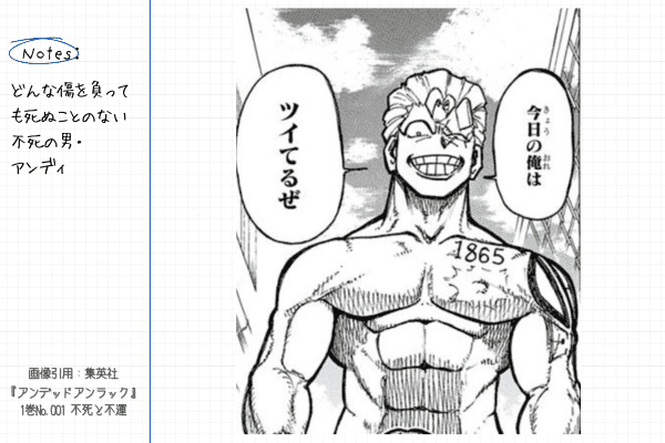 漫画『アンデッドアンラック』の面白いポイントを3つの視点から1つずつ紹介します。